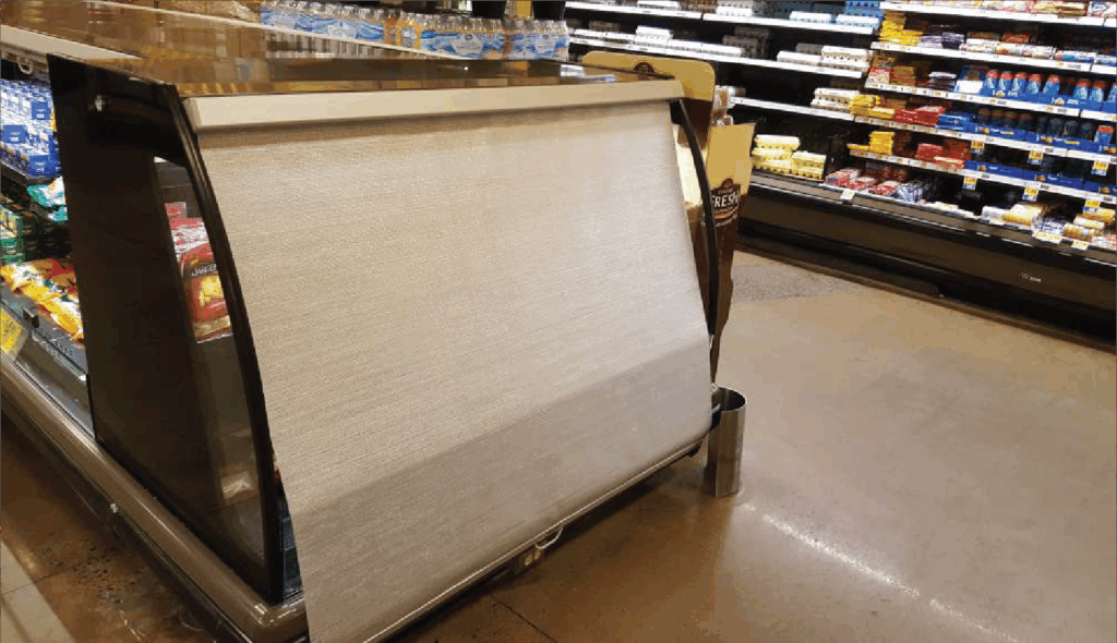 At close, staff lower the night covers for commercial refrigeration across the case opening. The woven aluminum fabric reflects radiant heat while the micro-perforated design allows minimal airflow to discourage condensation, so the case environment remains cold and dry. By physically separating the cold case from the warmer aisle, the barrier curbs infiltration, the main reason open cases drift upward in temperature at night. This is the essence of refrigeration energy management for open merchandisers: keep the cold where it belongs, and compressors don’t have to fight the store’s ambient conditions until morning.