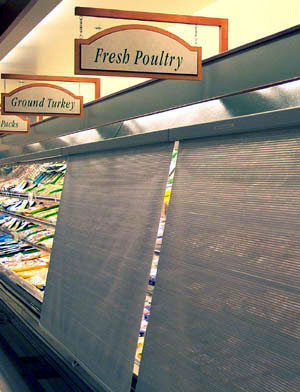 Econofrost night covers are woven aluminum fabric curtains designed to be pulled down over refrigerated display cases when stores close. Unlike improvised barriers, these covers are engineered to: